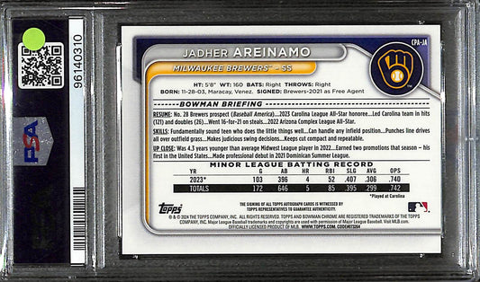2024 Bowman - Jadher Areinamo - Milwaukee Brewers - Baseball - # CPAJA - Chrome Prospect Purple Auto Refractor - 24/250 - PSA 10