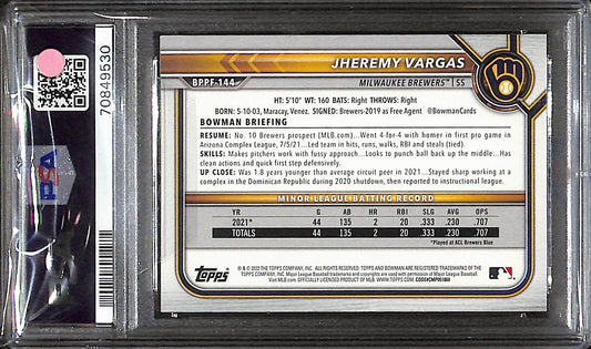 2022 Bowman 1st Edition - Jheremy Vargas - Baseball - Milwaukee Brewers - # BPPF 144 - Sky Blue Foil - PSA 10