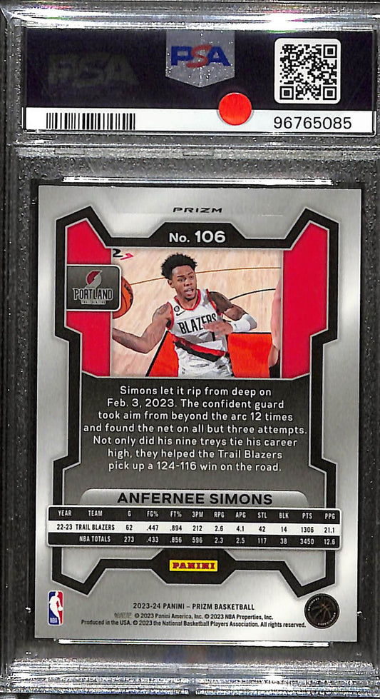 2023 Prizm - Anfernee Simons - Basketball - Portland Trailblazers - # 106 - White Sparkle - PSA 9