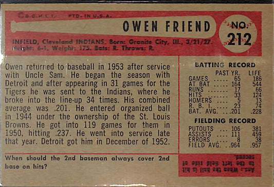 Owen Friend 1954 Bowman #212 Cleveland Indians